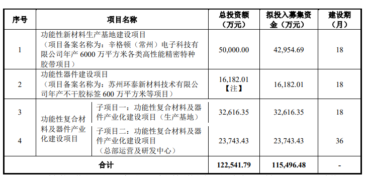 据招股书显示,高泰电子拟募集资金11.55亿元,募投项目包括:功能性新材料生产基地建设项目(项目备案名称为:辛格顿(常州)电子科技有限公司年产6000万平方米各类高性能精密特种胶带项目)、功能性器件建设项目(项目备案名称为:苏州环泰新材料技术有限公司年产不干胶标签600万平方米等项目)、功能性复合材料及器件产业化建设项目(生产基地)、功能性复合材料及器件产业化建设项目(总部运营及研发中心)。