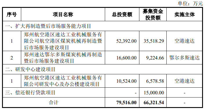 据招股书显示,速达股份本次拟募集资金66,321.54万元,募集资金扣除本次发行费用后用于“扩大再制造暨后市场服务能力项目”、“研发中心建设项目”、“偿还银行贷款项目”。