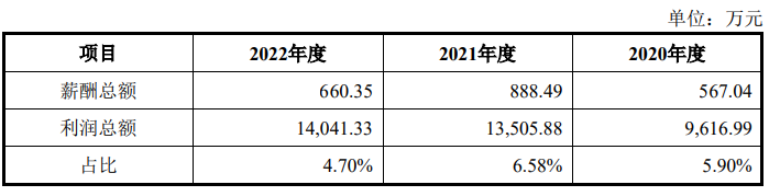 据招股书“报告期内薪酬总额占速达股份各期利润总额的比例”处显示,报告期内,公司董事、监事、高级管理人员及其他核心人员薪酬总额分别为567.04万元、888.49万元、660.35万元。