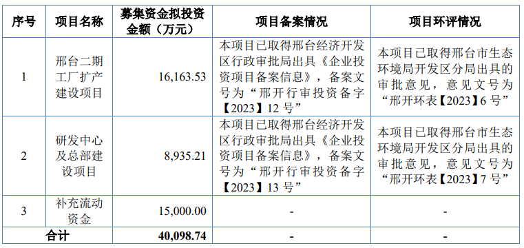 据招股书显示,纳科诺尔本次拟募资40,098.74万元,募集资金扣除本次发行费用后将用于公司邢台二期工厂扩产建设项目、研发中心及总部建设项目、补充流动资金。