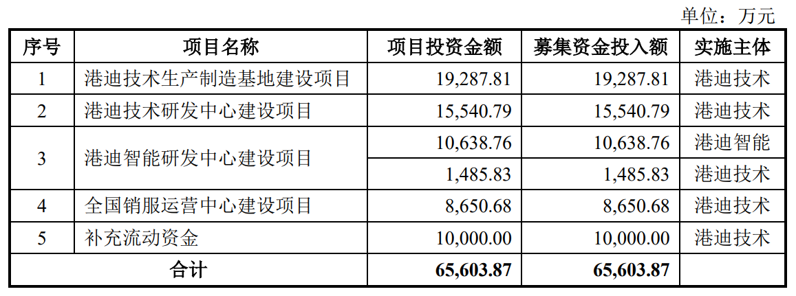 据招股书显示,港迪技术本次拟募集资金65,603.87万元,募集资金扣除本次发行费用后将分别用于港迪技术生产制造基地建设项目、港迪技术研发中心建设项目、港迪智能研发中心建设项目、全国销服运营中心建设项目、补充流动资金。