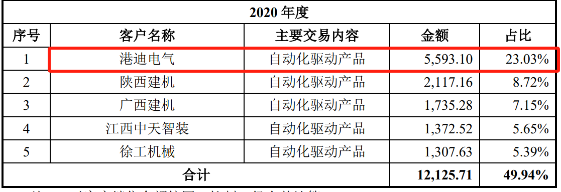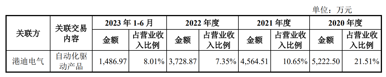 武汉港迪电气有限公司(以下简称“港迪电气”)系港迪技术关联方。据招股书“关联交易”处显示,报告期各期,公司向港迪电气的关联销售金额分别为5,222.50万元、4,564.51万元、3,728.87万元和1,486.97万元,占当期营业收入的比例分别为21.51%、10.65%、7.35%和8.01%。