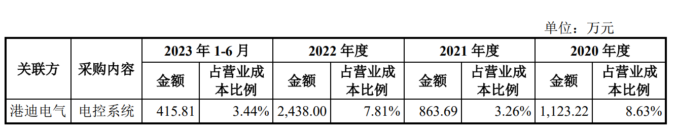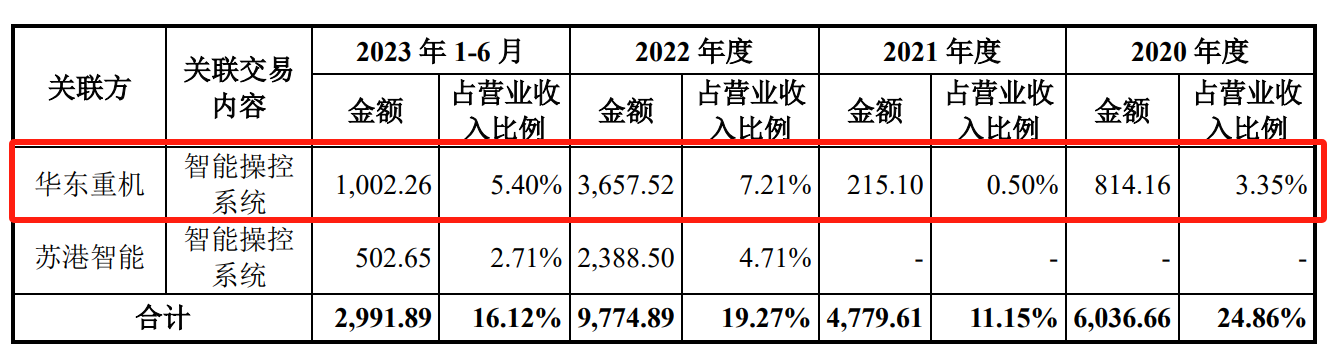 无锡华东重型机械股份有限公司(以下简称“华东重机”)也系港迪技术关联方,据招股书“关联交易”处显示,报告期各期,公司向华东重机关联销售金额分别为814.16万元、215.10万元、3,657.52万元和1,002.26万元,占当期营业收入的比例分别为3.35%、0.50%、7.21%和5.40%。