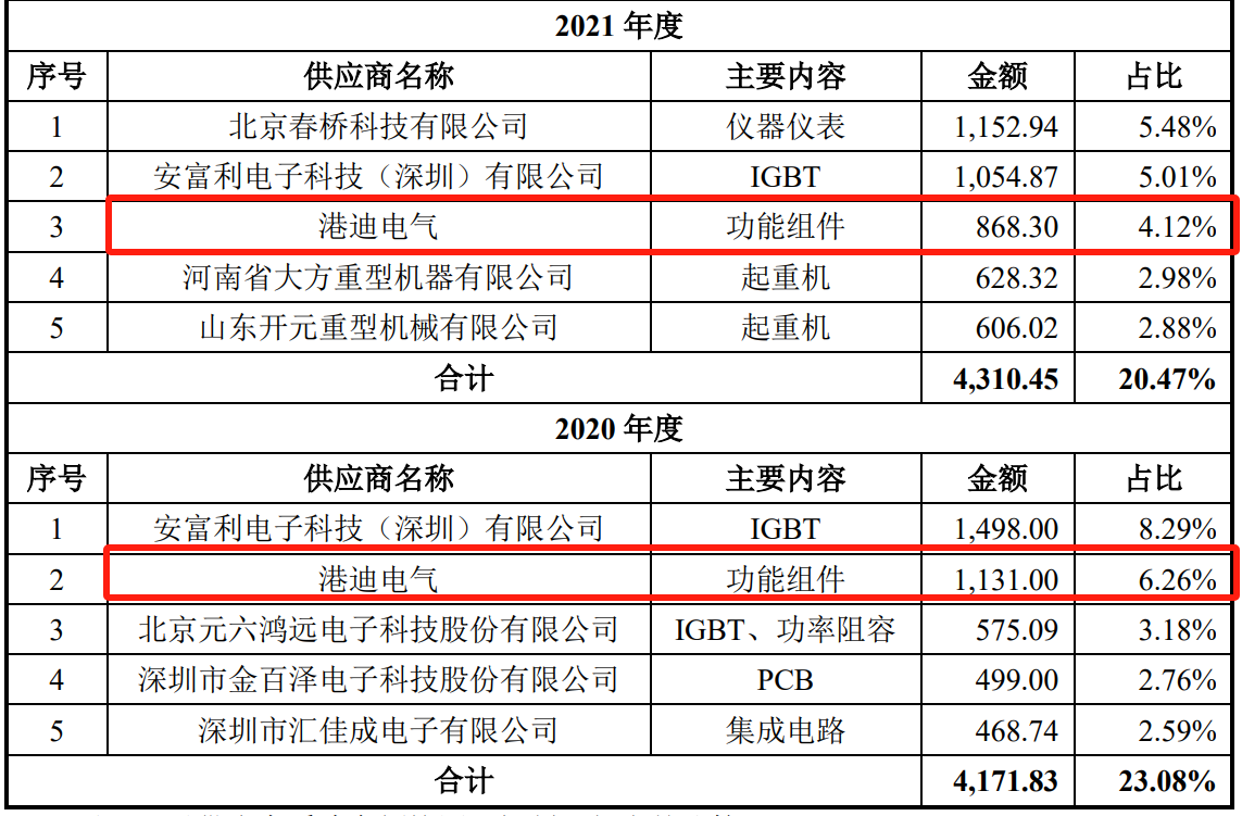 而据招股书“报告期内主要供应商情况”处显示,2020年和2021年,港迪电气分别为港迪技术第二大和第三大供应商,对应采购金额分别为1,131.00万元和868.30万元。这分别比招股书0.22万元和4.61万元。