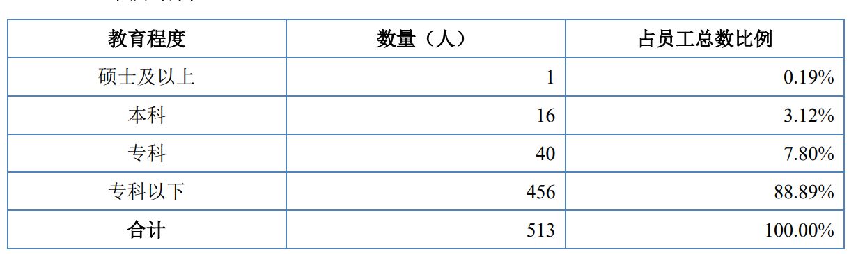 除此之外,宇星股份研发团队实力也是令人担忧。据招股书显示,截至2023年6月30日,公司拥有技术人员70人,占员工总数的比例为13.65%。而截至2023年6月30日,公司员工拥有本科及以上学历的员工仅仅只有17人,也就是说,公司的技术人员至少将有53人的学历在大专及以下学历,这也就意味着公司技术人员的学历普遍偏低。