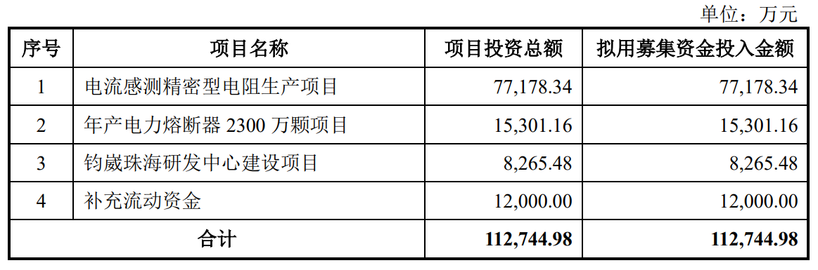 据招股书显示,钧崴电子本次拟募集资金11.27亿元,募集资金扣除本次发行费用后将用于公司电流感测精密型电阻生产项目、年产电力熔断器2300万颗项目、钧崴珠海研发中心建设项目、补充流动资金。