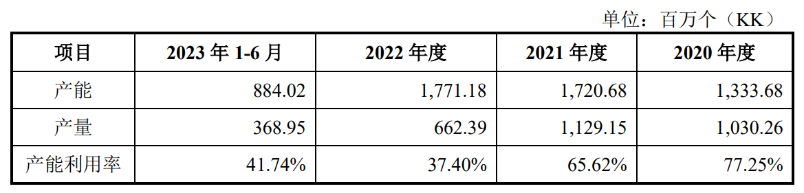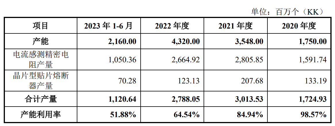 报告期各期,钧崴电子电流感测精密电阻产能分别为1,750.00百万个、3,548.00百万个、4,320.00百万个、2,160.00百万个;产量分别为1,724.93百万个、3,013.53百万个、2,788.05百万个、1,120.64百万个,对应产能利用率分别为98.57%、84.94%、64.54%、51.88%,逐年下降,报告期内电流感测精密电阻产能利用率下降了近50%。