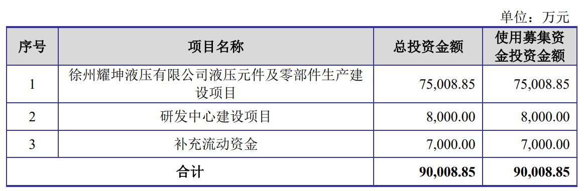 据招股书显示,耀坤液压本次拟募集资金90,008.85万元,募集资金扣除本次发行费用后将分别用于徐州耀坤液压有限公司液压元件及零部件生产建设项目、研发中心建设项目、补充流动资金。