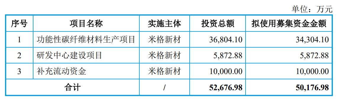 据招股书显示,米格新材本次拟募集资金50,176.98万元,募集资金扣除本次发行费用后将用于公司功能性碳纤维材料生产项目、研发中心建设项目、补充流动资金。