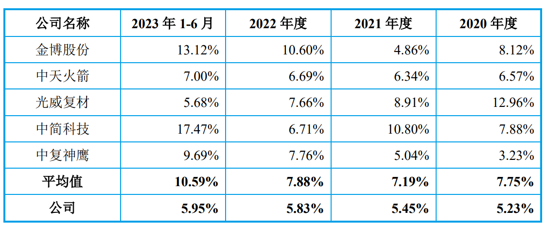 报告期各期,米格新材研发费用分别为711.00万元、1,652.19万元、2,555.30万元和1,548.05万元,占营业收入比例分别为5.23%、5.45%、5.83%和5.95%。而同期同行业可比公司研发费用率均值分别为7.75%、7.19%、7.88%和10.59%,公司研发费用率远低于同行业可比公司均值。