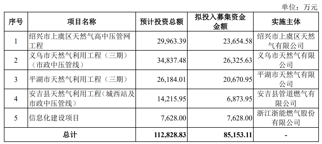 据招股书显示,浙能燃气本次拟募集资金85,153.11万元,募集资金扣除本次发行费用后将分别用于公司绍兴市上虞区天然气高中压管网工程、义乌市天然气利用工程(三期)(市政中压管线)、平湖市天然气利用工程(三期)、安吉县天然气利用工程(城西站及市政中压管线)、信息化建设项目。