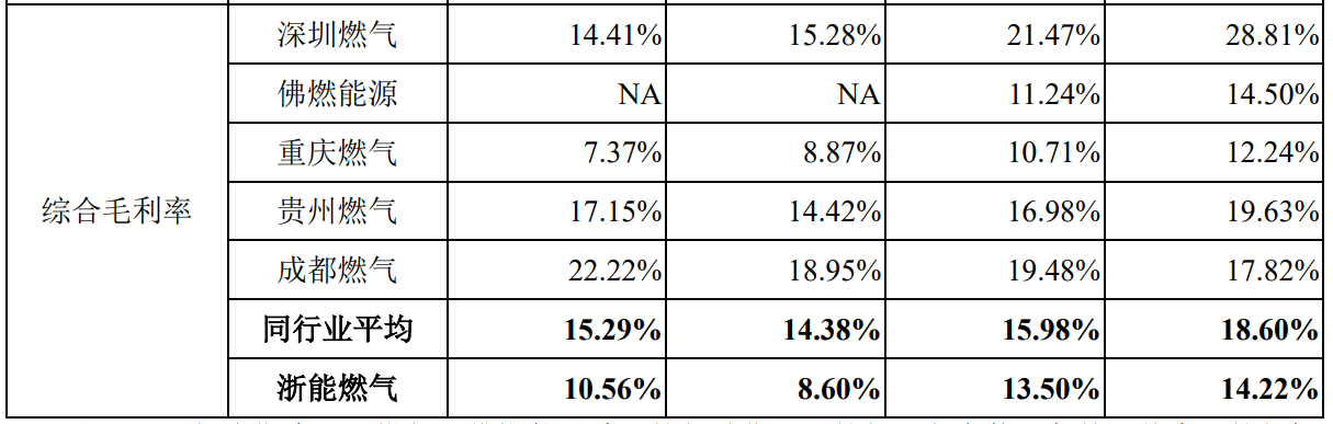 另外,报告期各期,浙能燃气同行业可比公司综合毛利率均值分别为18.60%、15.98%、14.38%和15.29%。可以看出,浙能燃气综合毛利率远低于同行业可比公司均值。