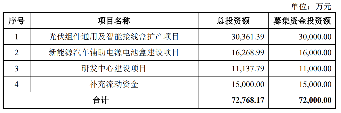据招股书显示,泽润新能本次拟募集资金72,000.00万元,募集资金扣除本次发行费用后将分别用于公司光伏组件通用及智能接线盒扩产项目、新能源汽车辅助电源电池盒建设项目、研发中心建设项目、补充流动资金。