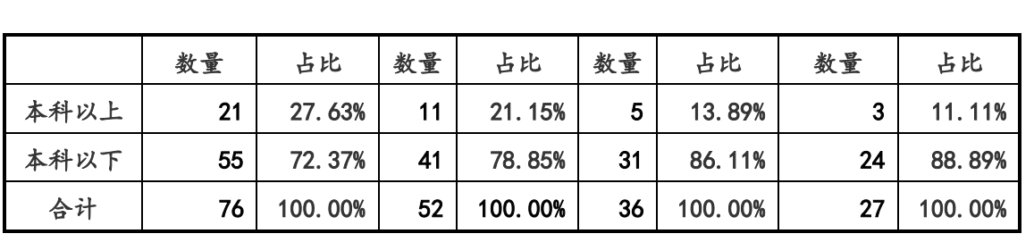报告期各期末,泽润新能研发人员分别为27人、36人、52人、76人,其中研发人员学历为本科以下的人数分别为24人、31人、41人、55人,占各期末研发人员总数的比例分别为88.89%、86.11%、78.85%、72.37%,占比较大。