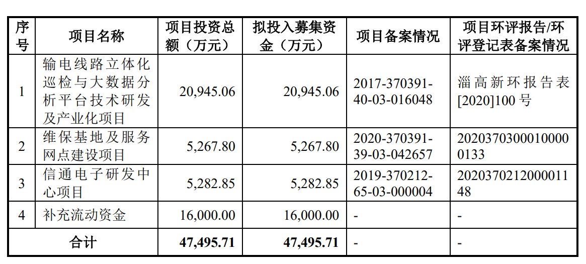 据招股书显示,信通电子本次拟募集资金47,495.71万元,募集资金扣除本次发行费用后将分别用于公司输电线路立体化巡检与大数据分析平台技术研发及产业化项目、维保基地及服务网点建设项目、信通电子研发中心项目、补充流动资金。其中将有16,000.00万元用于补充流动资金,占募集资金总额的比例为33.69%。