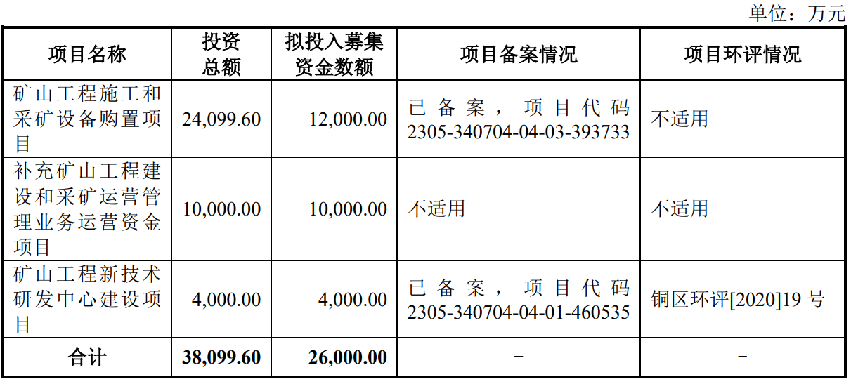 据招股书显示,铜冠矿建本次拟募集资金26,000.00万元,募集资金扣除本次发行费用后将分别用于公司矿山工程施工和采矿设备购置项目、补充矿山工程建设和采矿运营管理业务运营资金项目、矿山工程新技术研发中心建设项目。