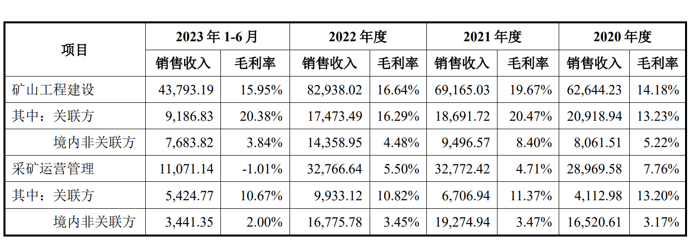 报告期各期,铜冠矿建对关联方矿山工程建设的销售收入分别为20,918.94万元、18,691.72万元、17,473.49万元和9,186.83万元,毛利率分别为13.23%、20.47%、16.29%和20.38%,对关联方采矿运营管理的销售收入分别为4,112.98万元、6,706.94万元、9,933.12万元和5,424.77万元,毛利率分别为13.20%、11.37%、10.82%和10.67%。