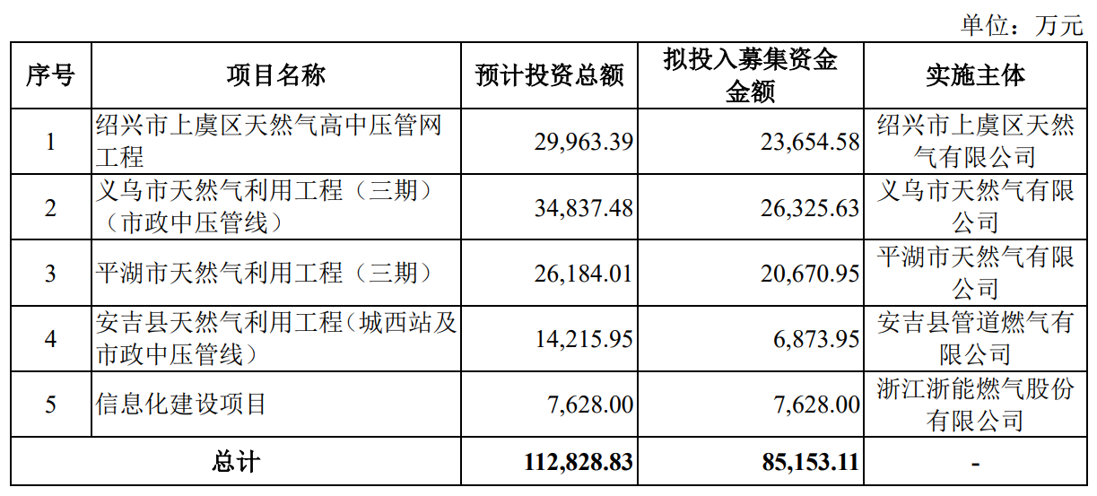 据招股书显示,浙能燃气本次拟募集资金85,153.11万元,募集资金扣除本次发行费用后将分别用于公司绍兴市上虞区天然气高中压管网工程、义乌市天然气利用工程(三期)(市政中压管线)、平湖市天然气利用工程(三期)、安吉县天然气利用工程(城西站及市政中压管线)、信息化建设项目。