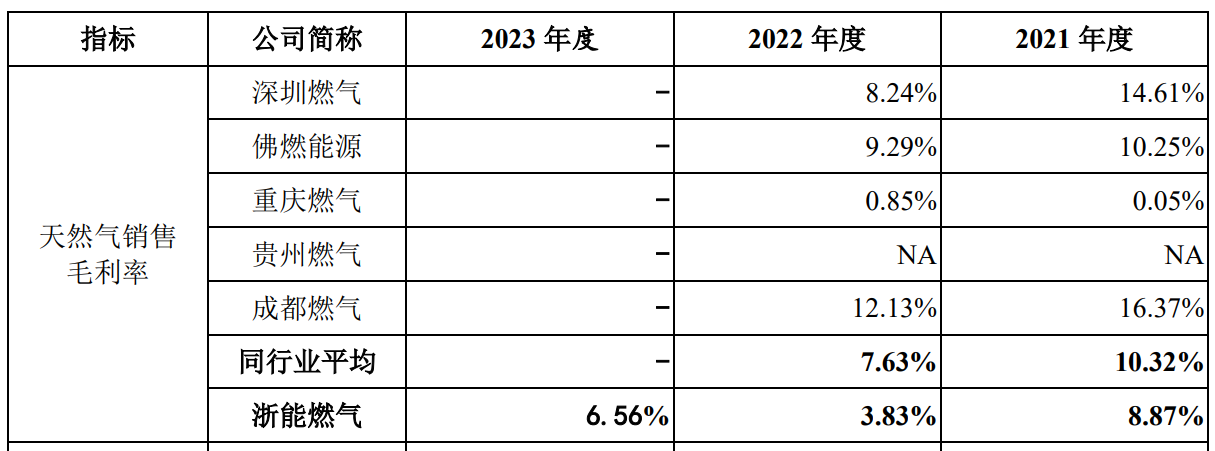 浙能燃气主营业务收入主要来自天然气销售、天然气工程安装服务,其中报告期内公司天然气销售业务在主营业务收入中占比分别为89.31%、91.59%和91.98%。值得注意的是,浙能燃气天然气销售毛利率还不及同行。报告期各期,公司天然气销售毛利率分别为8.87%、3.83%、6.56%。而据招股书显示,2021年和2022年,浙能燃气同行业可比公司天然气销售毛利率均值分别为10.32%和7.63%。