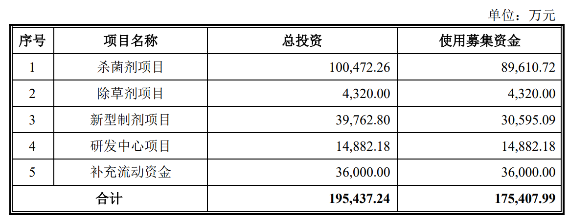 据招股书显示,泰禾股份本次拟募集资金175,407.99万元,募集资金扣除本次发行费用后将用于公司杀菌剂项目、除草剂项目、新型制剂项目、研发中心项目、补充流动资金。