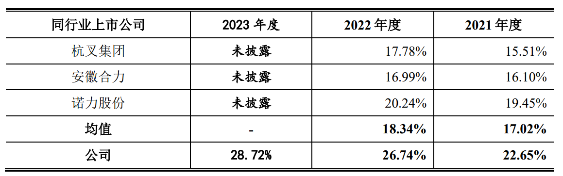 据招股书显示,报告期各期,中力股份综合毛利率分别为22.65%、26.74%、28.72%。值得注意的是,2021年和2022年,中力股份同行业可比公司综合毛利率均值分别为17.02%和18.34%。可以看出,中力股份综合毛利率不仅远高于同行业可比公司,而且在综合毛利率的增幅上也是远超同行业可比公司。