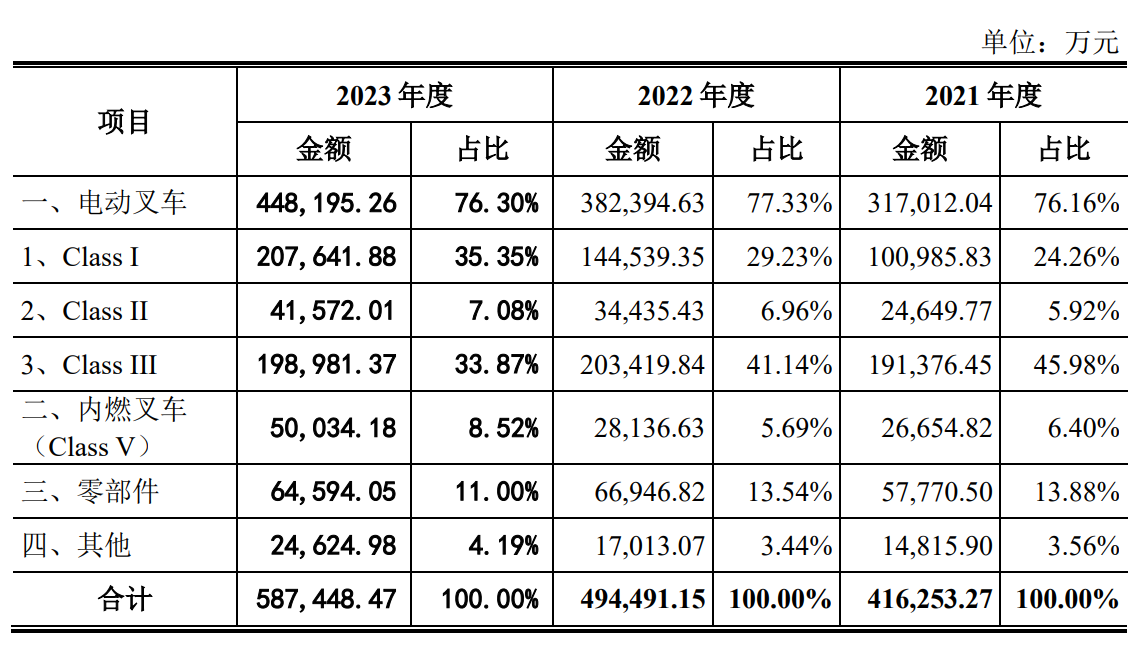 据招股书显示,中力股份的自产机动工业车辆主要分为电动叉车和内燃叉车,合计占主营业务收入比例80%左右,是公司收入的主要来源。其中,电动叉车报告期内的销售金额占主营业务收入的比例分别为76.16%、77.33%、76.30%。电动叉车收入构成中,又以ClassI和ClassIII为主。