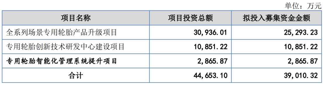 据招股书显示,泰凯英本次募集资金39,010.32万元,募集资金扣除发行费用后将用于公司全系列场景专用轮胎产品升级项目、专用轮胎创新技术研发中心建设项目、专用轮胎智能化管理系统提升项目,具体如下: