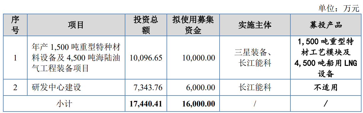 据招股书显示,长江能科本次拟募集资金16,000.00万元,募集资金扣除本次发行费用后将用于公司年产1,500吨重型特种材料设备及4,500吨海陆油气工程装备项目、研发中心建设,具体如下: