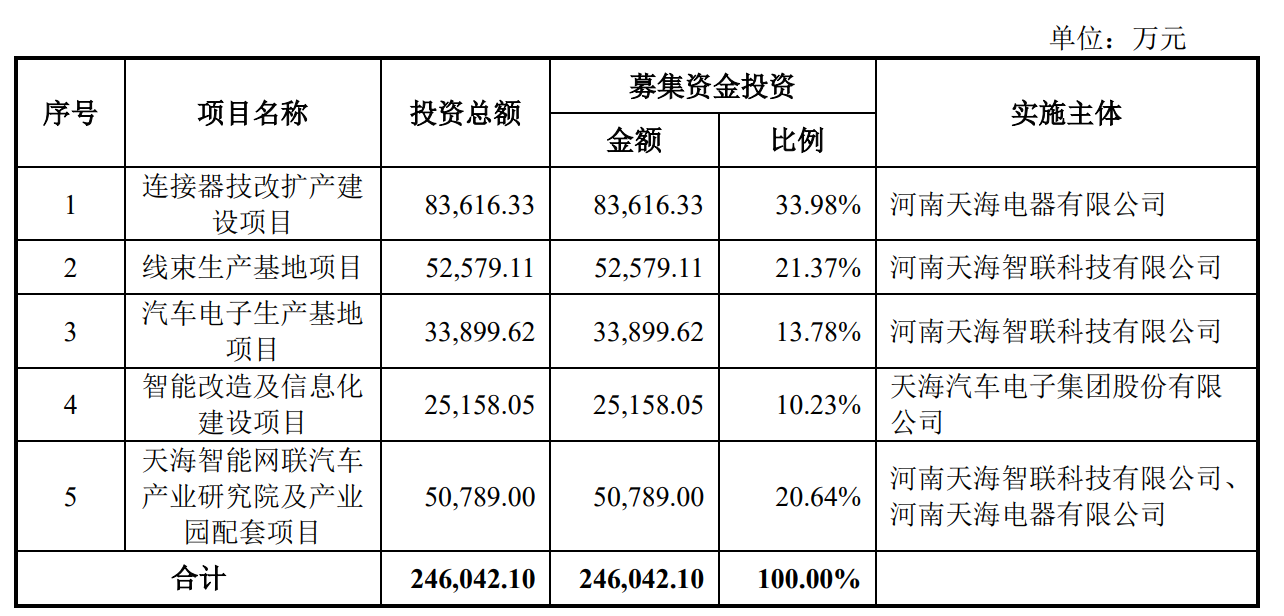 据招股书显示,天海电子拟在深交所主板上市,拟募集资金246,042.10万元,募集资金扣除本次发行费用后将分别用于公司连接器技改扩产建设项目、线束生产基地项目、汽车电子生产基地项目、智能改造及信息化建设项目、天海智能网联汽车产业研究院及产业园配套项目,具体如下: