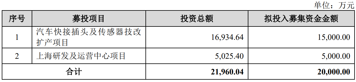 据招股书显示,弥富科技拟在北交所上市,拟募集资金15,935.00万元,募集资金扣除本次发行费用后将用于公司汽车快接插头及传感器技改扩产项目、上海研发及运营中心项目,具体如下: