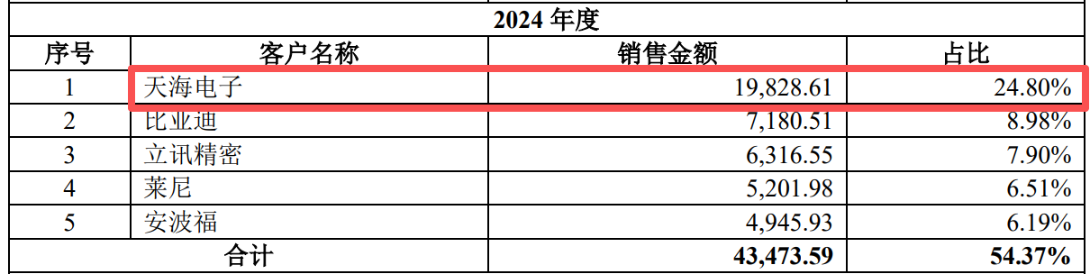 据招股书显示,在2024年度中,海昌智能的前五大客户(1-5)分别为天海电子、比亚迪、立讯精密、莱尼、安波福,对应销售金额分别为19,828.61万元、7,180.51万元、6,316.55万元、5,201.98万元、4,945.93万元。