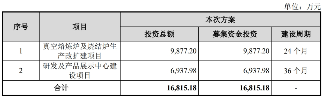 据招股书显示,广泰真空本次拟募集资金16,815.18万元,募集资金扣除本次发行费用后将分别为用于公司真空熔炼炉及烧结炉生产改扩建项目、研发及产品展示中心建设项目,具体如下:
