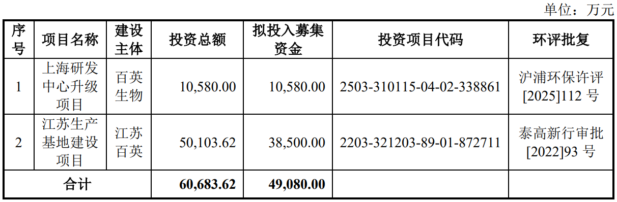 据招股书显示,百英生物拟在北交所上市,拟募集资金49,080.00万元,募集资金扣除本次发行费用后将用于公司上海研发中心升级项目、江苏生产基地建设项目,具体如下: