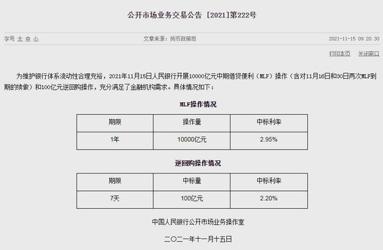 2021年11月15日,中国央行开展1万亿元1年期MLF操作,利率维持在2.95%不变。周二有8000亿元MLF到期,11月30日还有2000亿元MLF到期。