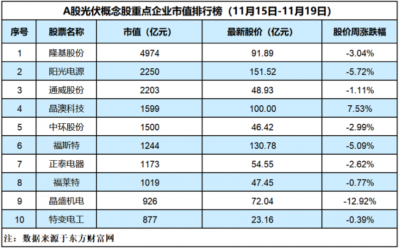 本周(11月15日-11月19日)光伏板块步入调整期,《华夏时报》记者重点监测的10家企业中,九家股价下跌,仅晶澳科技上涨了7.53%。跌幅最高的是晶盛机电,跌幅为12.92%。晶澳科技和福莱特最新股价分别为1599亿元和1019亿元,市值排名各上调一位。