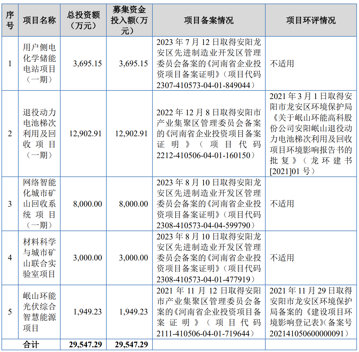 岷山环能拟在北交所上市,拟募资29,547.29万元,用于用户侧电化学储能电站项目(一期)、退役动力电池梯次利用及回收项目(一期)、网络智能化城市矿山回收系统项目(一期)、材料科学与城市矿山联合实验室项目和岷山环能光伏综合智慧能源项目。