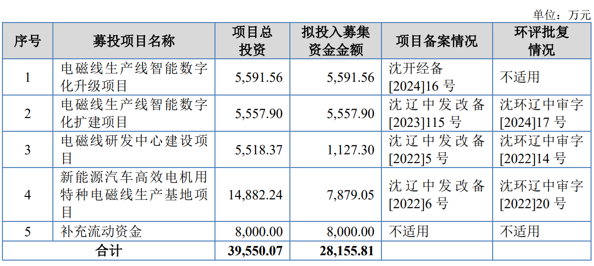 据招股书显示,宏远股份本次拟募集资金28,155.81万元,募集资金扣除本次发行费用后将用于公司电磁线生产线智能数字化升级项目、电磁线生产线智能数字化扩建项目、电磁线研发中心建设项目、新能源汽车高效电机用特种电磁线生产基地项目、补充流动资金,具体如下: