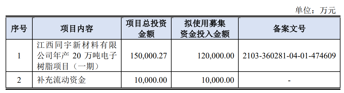 据招股书显示,同宇新材本次拟募集资金130,000.00万元,募集资金扣除本次发行费用后将用于江西同宇新材料有限公司年产20万吨电子树脂项目(一期)、补充流动资金,具体如下: