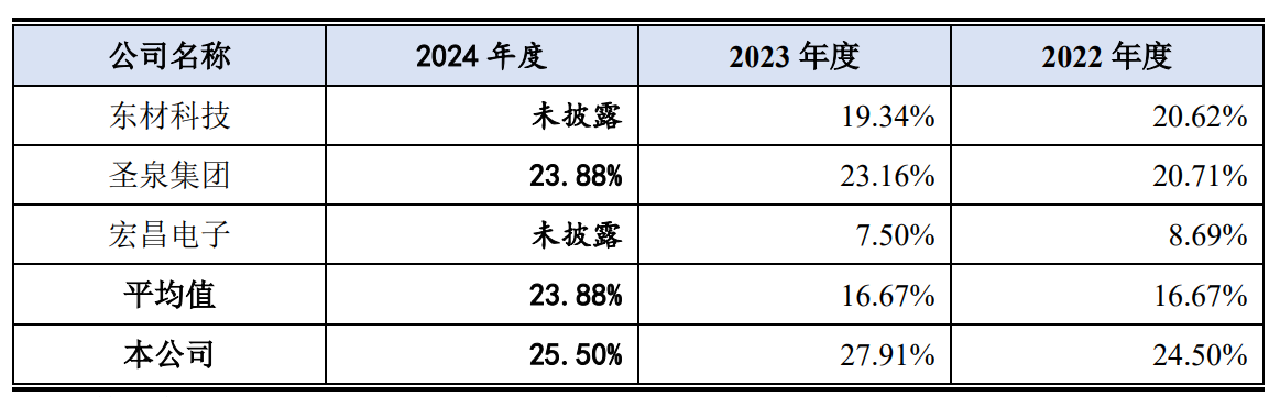 除此之外,据招股书显示,报告期各期,同宇新材主营业务毛利率分别为24.50%、27.91%和25.50%,也呈现小幅度的波动。同宇新材招股书将东材科技、圣泉集团、宏昌电子认定为同行业可比公司。2022年和2023年,东材科技的主营业务毛利率分别为20.63%和19.34%,宏昌电子的主营业务毛利率分别为8.79%和7.50%,报告期各期,圣泉集团的主营业务毛利率分别为20.71%、23.16%和23.88%对比来看,报告期内,同宇新材的主营业务毛利率明显高于同行业可比公司,这是否合理?