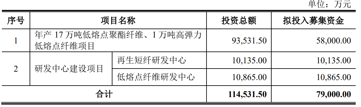 据招股书显示,天富龙集团本次拟募集资金79,000.00万元,募集资金扣除本次发行费用后将用于公司年产17万吨低熔点聚酯纤维、1万吨高弹力低熔点纤维项目;研发中心建设项目(再生短纤研发中心、低熔点纤维研发中心),具体如下:
