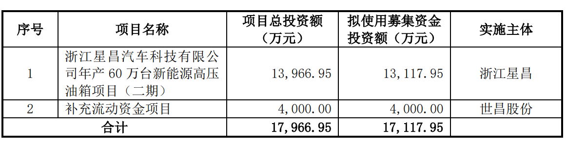 据招股书显示,世昌股份拟本次募集资金17,117.95万元,募集资金扣除本次发行费用后将用于浙江星昌汽车科技有限公司年产60万台新能源高压油箱项目(二期)、补充流动资金项目,具体如下:
