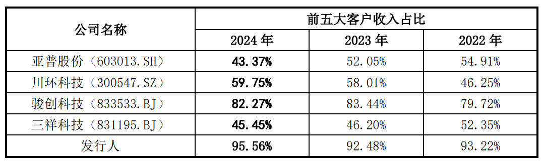 据招股书显示,世昌股份将亚普股份(603013.SH)、川环科技(300547.SZ)、川环科技(300547.SZ)、三祥科技(831195.BJ)认定为同行业可比上市公司。报告期各期,世昌股份同行业可比上市公司亚普股份前五大客户收入占比分别为54.91%、52.05%、43.37%,川环科技前五大客户收入占比分别为46.25%、58.01%、59.75%,川环科技前五大客户收入占比分别为79.72%、83.44%、82.27%,三祥科技前五大客户收入占比分别为53.35%、46.20%、45.45%。不难看出,世昌股份前五大客户收入占比显著高于同行业可比上市公司。