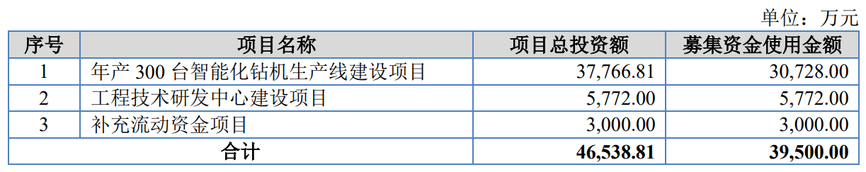 据招股书显示,志高机械本次拟募集资金39,500.00万元,募集资金扣除本次发行费用后将用于公司年产300台智能化钻机生产线建设项目、工程技术研发中心建设项目、补充流动资金项目,具体如下: