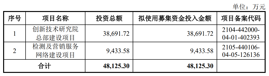 据招股书显示,广东建科本次拟募集资金48,125.30万元,募集资金扣除本次发行费用后将分别用于公司创新技术研究院总部建设项目、检测及营销服务网络建设项目,具体如下: