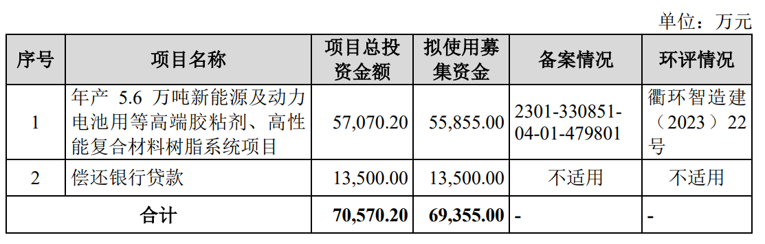 据招股书显示,道生天合本次拟募集资金69,355.00万元,募集资金扣除本次发行费用后将分别用于公司“年产5.6万吨新能源及动力电池用等高端胶粘剂、高性能复合材料树脂系统项目”“偿还银行贷款”,具体如下: