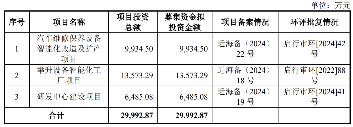据招股书显示,巴兰仕本次拟募集资金29,992.87万元,募集资金扣除本次发行费用后将用于公司汽车维修保养设备智能化改造及扩产项目、举升设备智能化工厂项目、研发中心建设项目,具体如下: