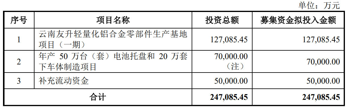 据招股书显示,友升股份本次拟募集资金247,085.45万元,募集资金扣除本次发行费用后将用于云南友升轻量化铝合金零部件生产基地项目(一期)、年产50万台(套)电池托盘和20万套下车体制造项目、补充流动资金,具体如下: