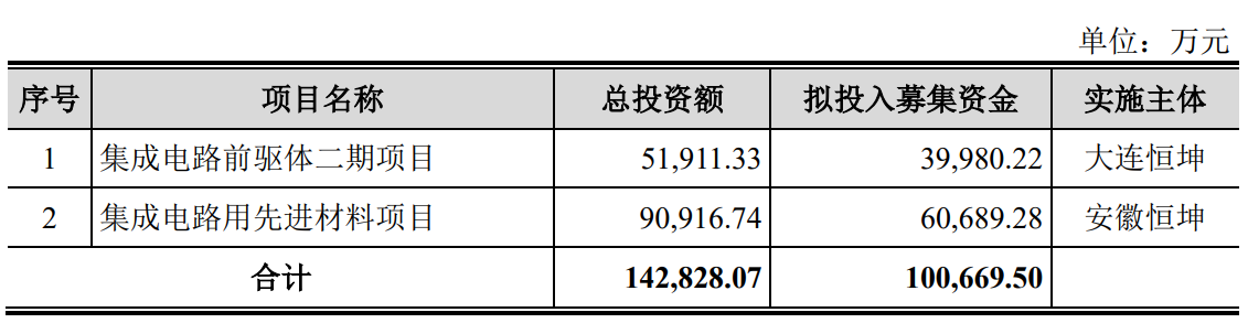 据招股书显示,恒坤新材本次在上交所科创板拟募集资金100,669.50万元,募集资金扣除本次发行费用后将用于公司集成电路前驱体二期项目、集成电路用先进材料项目,具体如下:
