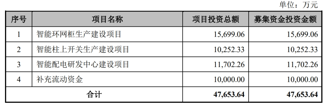 据招股书显示,昊创瑞通本次拟募集资金47,653.64万元,募集资金扣除本次发行费用后将分别用于智能环网柜生产建设项目、智能柱上开关生产建设项目、智能配电研发中心建设项目、补充流动资金,具体如下: