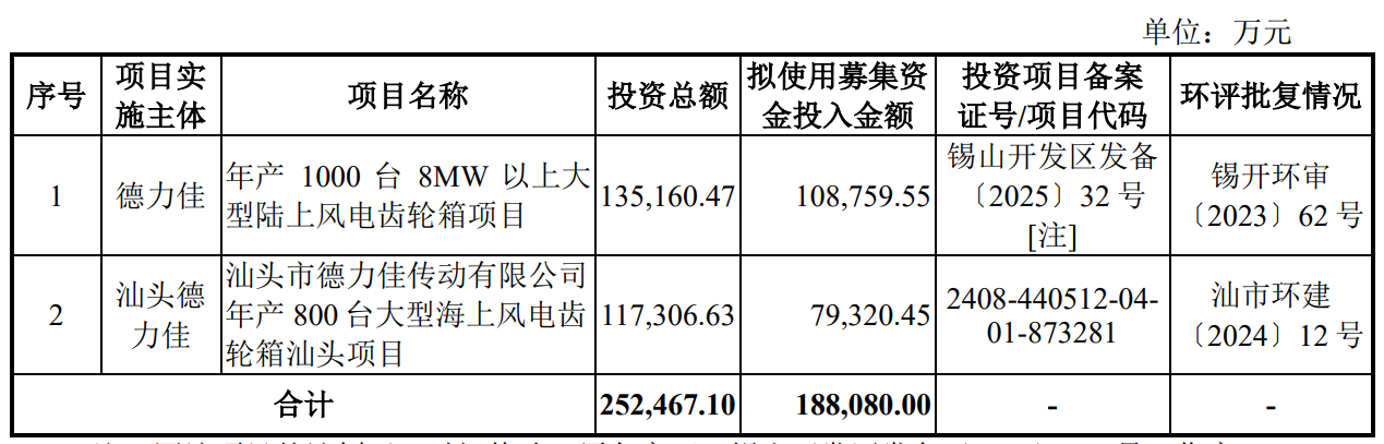 据招股书显示,德力佳拟在上交所主板募集资金188,080.00万元,募集资金扣除本次发行费用后将用于公司年产1000台8MW以上大型陆上风电齿轮箱项目、汕头市德力佳传动有限公司年产800台大型海上风电齿轮箱汕头项目,具体如下: